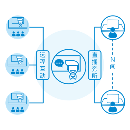 考慮到全國范圍內教育信息化建設不均衡、教學環境條件有差異的情況,同時為滿足“一帶多”的遠程互動需求,希沃互動錄播方案采用了常規錄播交互和直播旁聽結合的“無邊界”互動方式。即1個授課教室,可以同時連接3個遠程教室進行遠程互動,同時還能通過直播鏈接或二維碼的分享,滿足多個旁聽觀摩需求,以提高優課資源的利用率。
