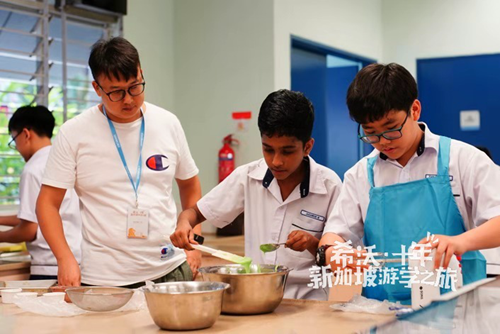 “在新加坡,我們崇尚學生從娛樂和探索中學習、從藝術中學習、走到大自然中去學校,希望學生不僅學到語言、科學等知識,還能掌握基本的生活技能、發展個人興趣愛好、學會關愛社會,所以我們還開設了家政課、小提琴、古箏等等課程,全面培養學生的綜合素養。”學校主任分享道。家政課給大家留下了深刻的印象,老師們走進課堂,與學生一起體驗了一把蛋糕烘焙課。