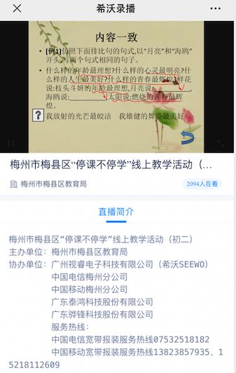 梅縣區(qū)的網(wǎng)絡(luò)直播課堂運(yùn)行已經(jīng)成熟,教育局已啟動(dòng)其他下屬各地區(qū)的覆蓋式網(wǎng)絡(luò)直播課方案,響應(yīng)省教育廳3月2號(hào)起不返校網(wǎng)絡(luò)授課的精神;目前直播參與人數(shù)峰值一度達(dá)到近5.5萬人同時(shí)在線,平均在線人數(shù)約2.4萬。希沃作為教育局?jǐn)y手的優(yōu)先平臺(tái),將竭盡全力保證直播課程的順利有序進(jìn)行,共同打贏抗疫不停學(xué)的戰(zhàn)斗。