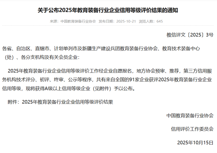 2025年10月,中國教育裝備行業協會公布《2025年教育裝備行業企業信用等級評價結果》。