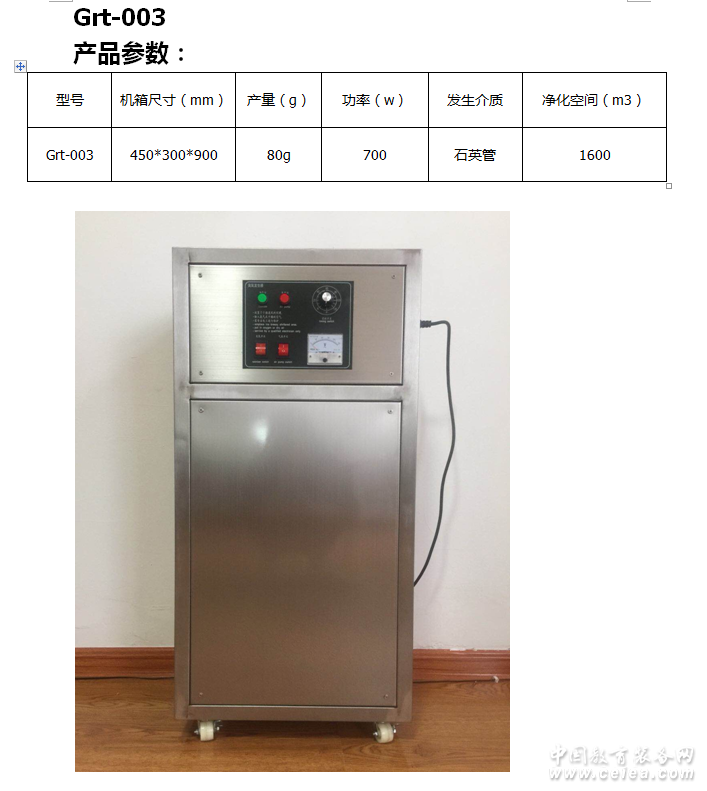 型號 臭氧產量 臭氧濃度 功率 使用電源 機身尺寸 凈化面積 冷卻方式 氣源 Grt-9100T 100g 15-30mg/L 1000 220v/50hz 45*30*90cm 2000m3 風冷 空氣 |