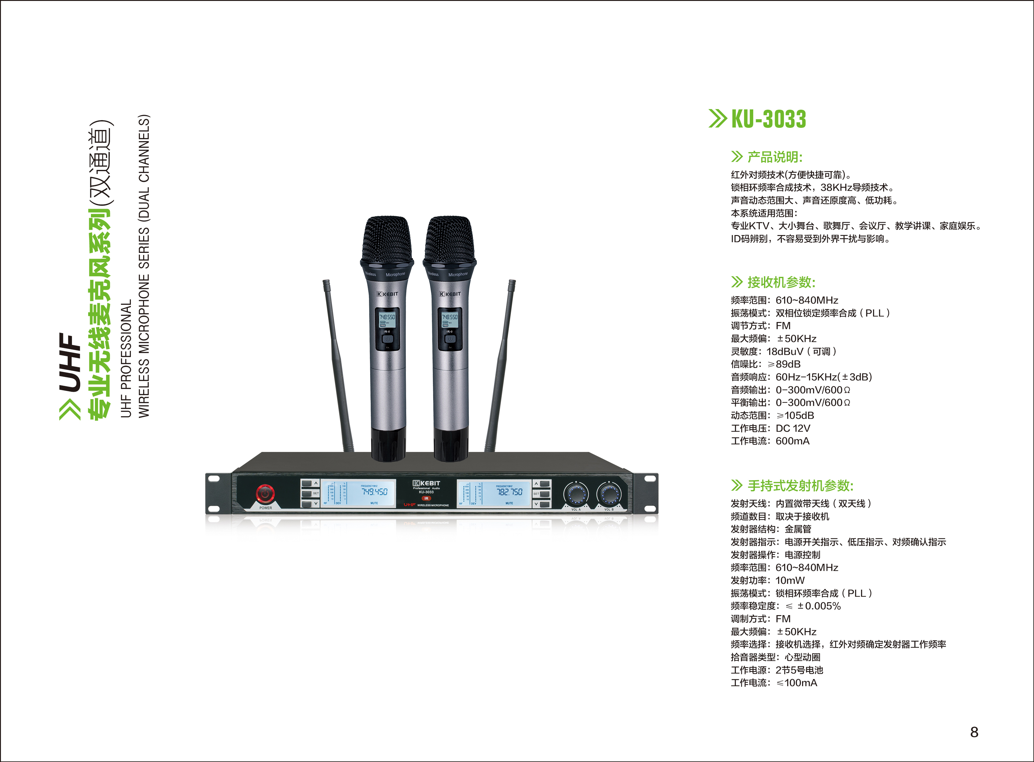 產品詳細介紹接收機技術參數: 頻率范圍:740-820MHz 振蕩模式:雙相位鎖定頻率合成(PLL) 調節方式:FM 最大頻偏:±50KHz 靈敏度:18dBuV(可調) 信噪比:≥89dB 音頻響應:60Hz-15KHz(±3dB) 音頻輸出:0-300mV/600Ω 平衡輸出:0-300mV/600Ω 動態范圍:≥105dB 顯示:大屏液晶顯示頻道數 工作電壓:DC 12V 工作電流 600mA 工作溫度:-10℃至+40℃ 手持式發射器參數: 發射天線:內置微帶天線 頻道數目:取決于接收機 發射器結構:金屬管 發射器指示:電源開關指示、低壓指示、對頻確認指示 發射器操作:電源控制 頻率范圍:740-820MHz 發射功率:10mW 振蕩模式:鎖相環頻率合成(PLL) 頻率穩定度:≤ ±0.005% 調制方式:FM 最大頻偏:±50KHz 頻率選擇:接收機選擇,紅外對頻確定發射器工作頻率 拾音器類型:心型動圈 工作電源:2節5號電池 工作電流:≤100mA |