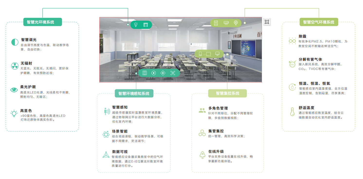 數言智慧環(huán)境教室的構成分為智慧光環(huán)境系統(tǒng)、智慧環(huán)境感知系統(tǒng)、智慧集控系統(tǒng)、智慧空氣環(huán)境系統(tǒng)。