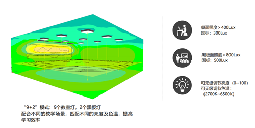數言信息智慧光環境系統支持自由調節亮度和色溫,聯動預設的10種教學場景模式,可供自由切換;高透的LED優質光源,光線柔和不刺眼,照度均勻,無暗區;>90顯色性,還原物體真實的色彩;并且所使用的燈無藍光、無眩光、無頻閃,能更有效的保護眼睛,預防近視。