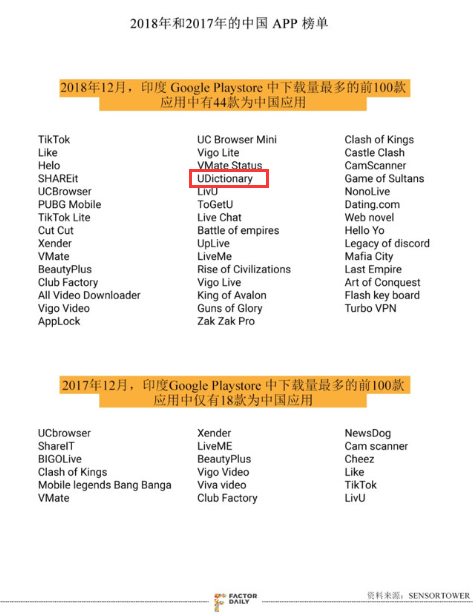 眾所周知,近年來印度市場已成為中國App紛紛選擇出海的第一站。截至2018年年底, 印度Google Play Store移動應用Top 100(涵蓋不同分類)的App中,中國App就占了44個,U-Dictionary便是其中一款。在登陸印度市場僅數(shù)月內,U-Dictionary即在“Best Self-Improvement”細分榜單中名列第一,超過了在全球備受歡迎的TED與語言學習工具Duolingo(多鄰國),同時也領先印度本土的學習App:BYJU'S。
