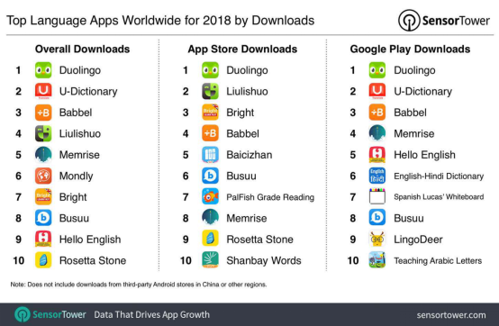 另外,SensorTower數(shù)據(jù)還顯示,2018年全球語言類App下載量榜單排名,U-Dictionary在下載量總榜與Google Play下載量排行榜上均排名第二,僅次于老牌產品Duolingo。