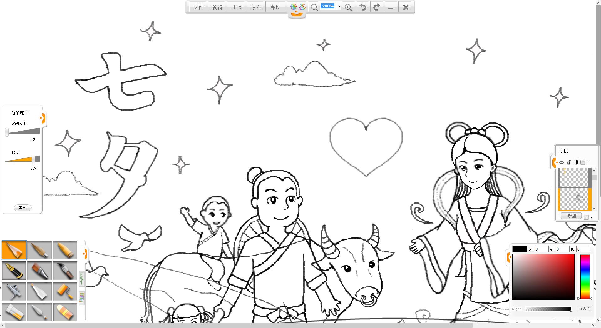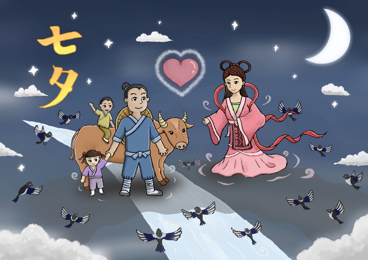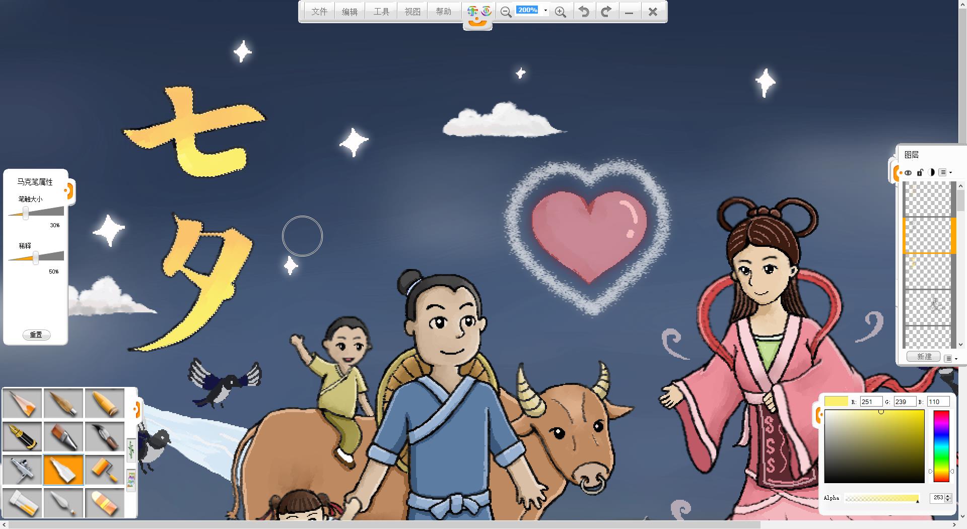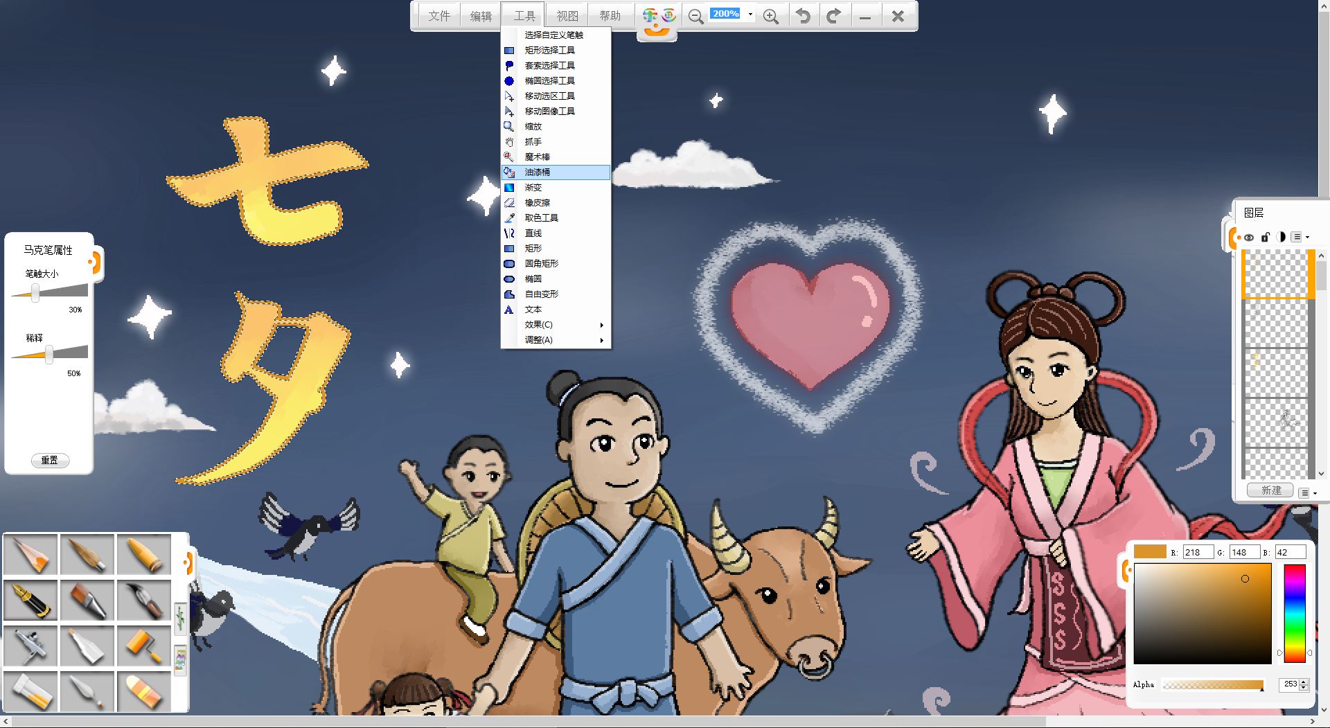 9.使用鉛筆筆觸在畫面左上方書寫“七夕”兩個字。