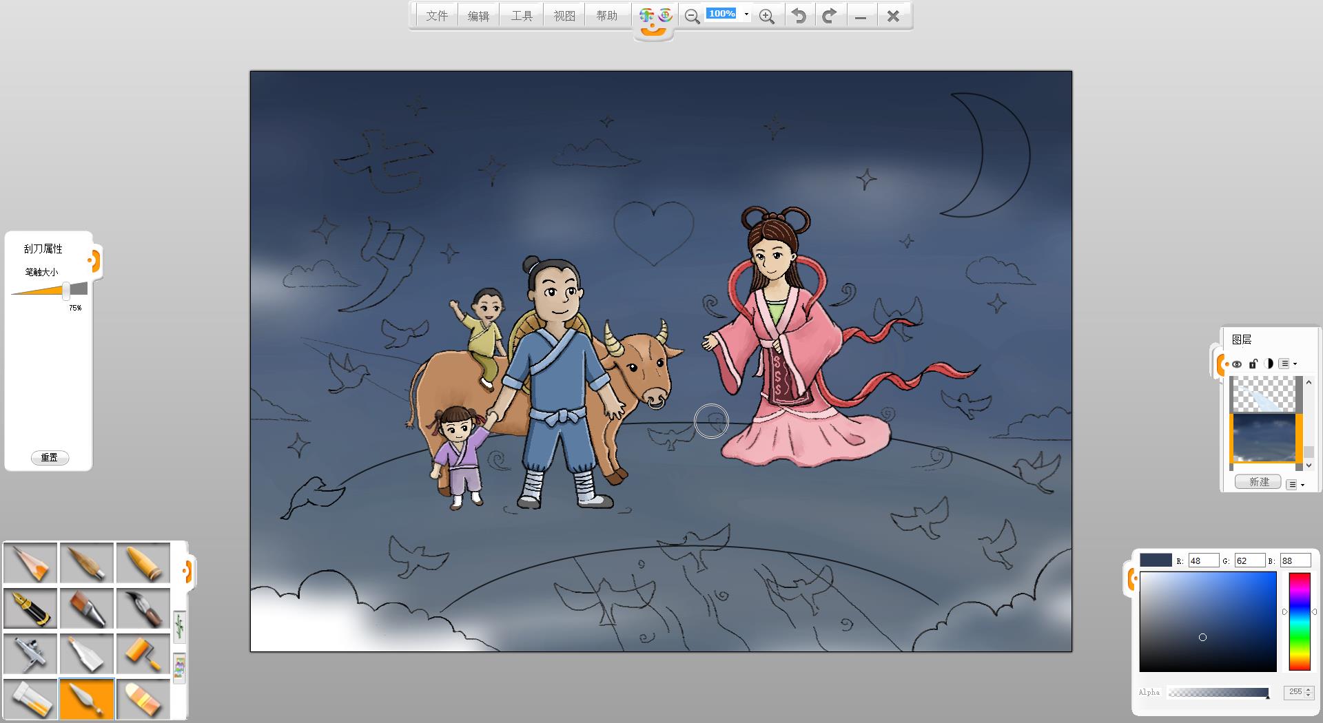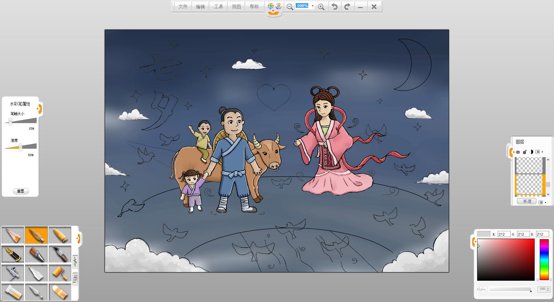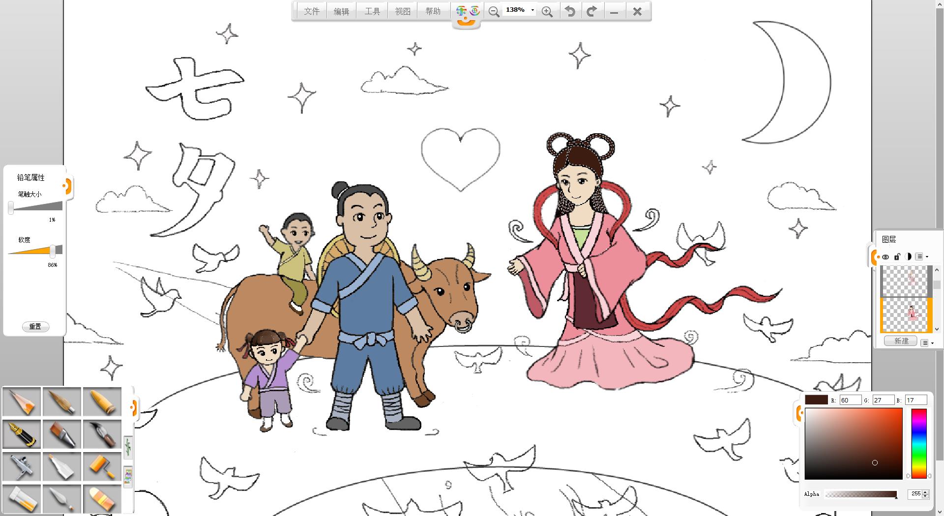 9.使用鉛筆筆觸在畫面左上方書寫“七夕”兩個字。