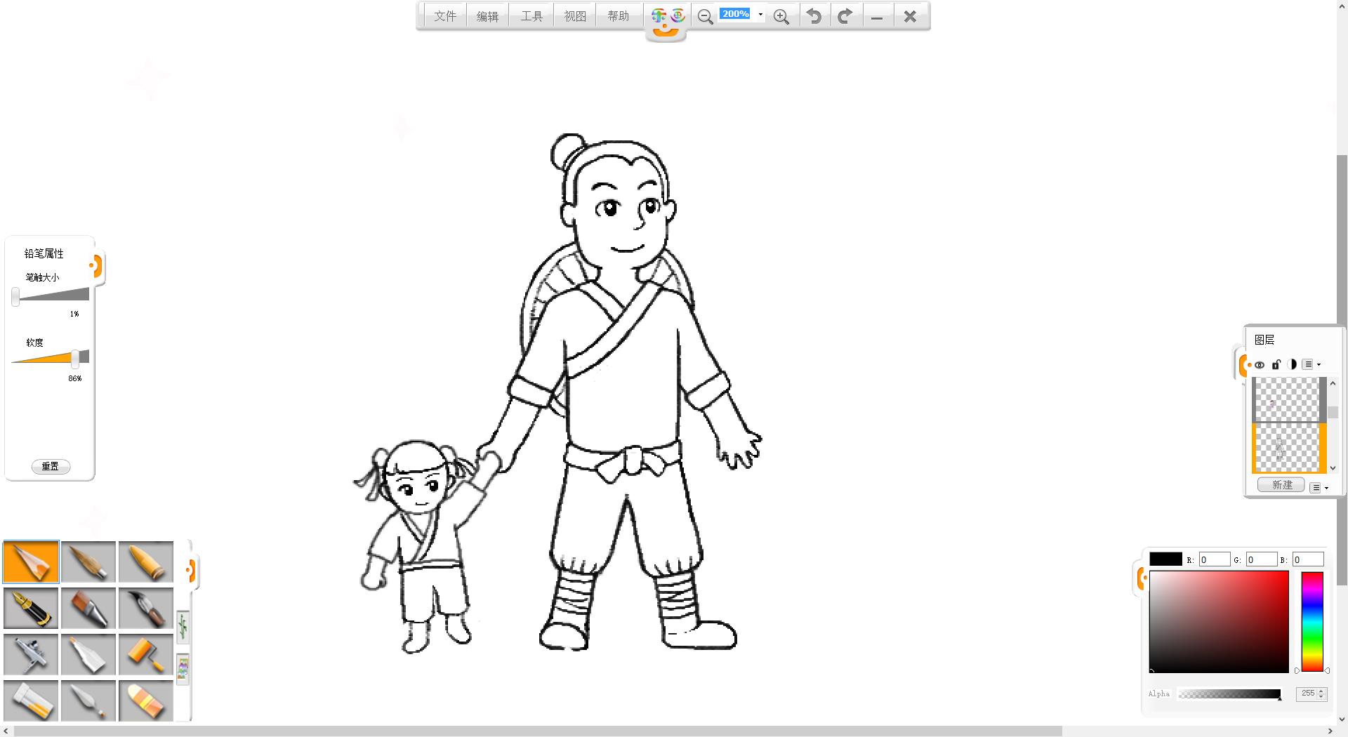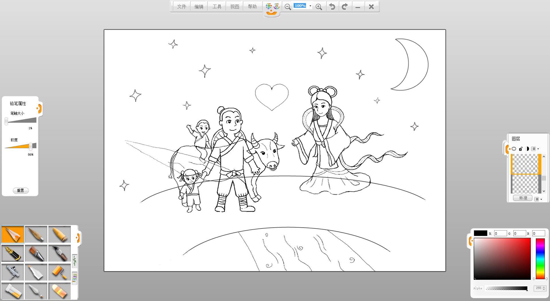 4.在畫面左側使用鉛筆筆觸繪制一個牽著女兒的牛郎形象。