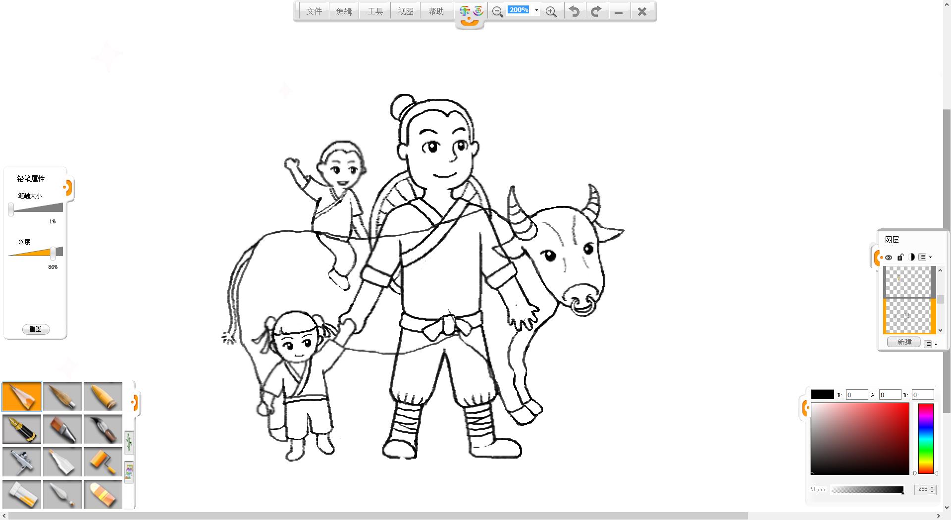 5.繼續使用鉛筆筆觸繪制騎著牛的兒子形象。