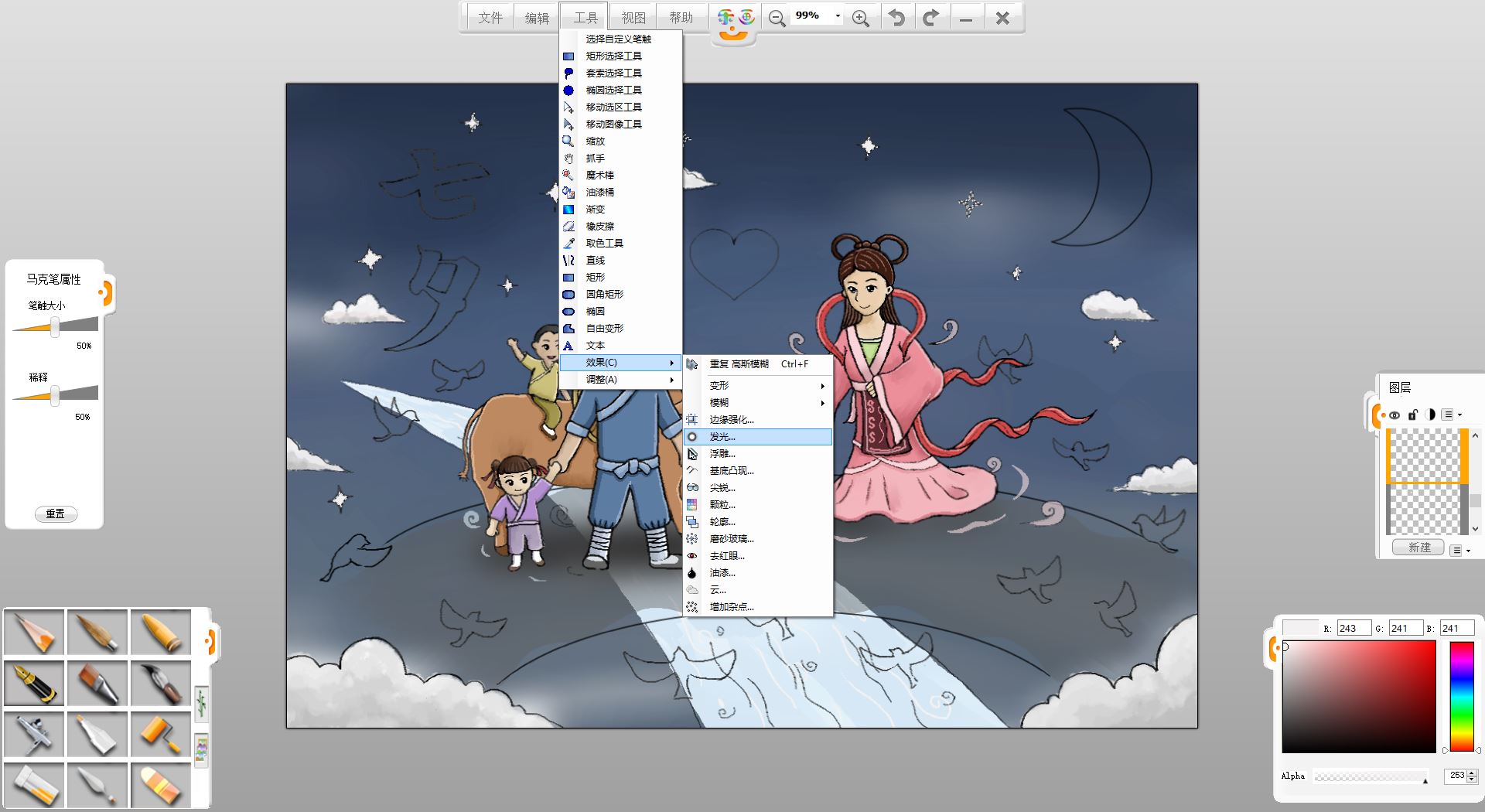 20.使用魔術棒和油漆桶工具為星星填色后,在工具菜單下,使用“效果”-“發光”工具,為星星增加發光效果。