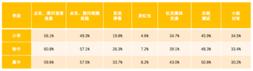 各學段具體在使用七項互動方法的百分比如下圖,除了最常見的三種互動方式(語音連麥、視頻連線、在線測試)以外,高中教師還喜歡通過發彈幕、社交媒體交流等方式互動。
