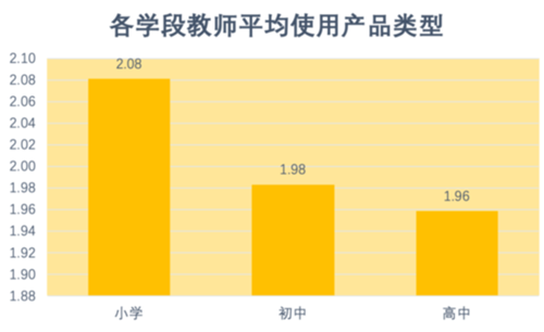 教師根據個人教學需求和偏好,會選取不同類型的平臺開展教學活動,選用的平臺類型越豐富,意味著教學形式多樣化的可能性越高。下面根據不同學段、學科和學校類型,分別分析教師平均使用產品類型的數量(最高使用7類,最低使用1類),以及各類型產品在教師中的使用覆蓋率會有什么樣的差別。