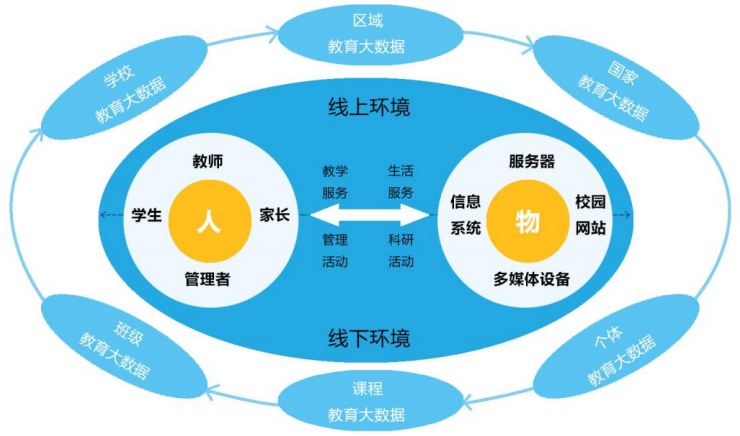 教育大數據采集根據來源和范圍,可分為個體教育大數據、課程教育大數據、班級教育大數據、學校教育大數據、區域教育大數據和國家教育大數據;根據場景可分為線上教學和線下教學數據;根據數據源可分為“人”和“物”,“人”即學生、教師、管理者、家長,“物”即信息系統、校園網站、服務器、多媒體設備等。