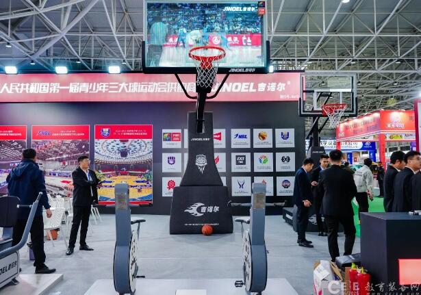展區(qū)內(nèi),吉諾爾JNE-011智能比賽籃球架與JNE-017青少年升降式籃球架、新型籃板、JNE-9221 自發(fā)電磁阻健身車、JNE-9224自發(fā)電磁阻劃船訓(xùn)練器等器材整齊陳列,吸引眾多觀眾駐足體驗(yàn)。