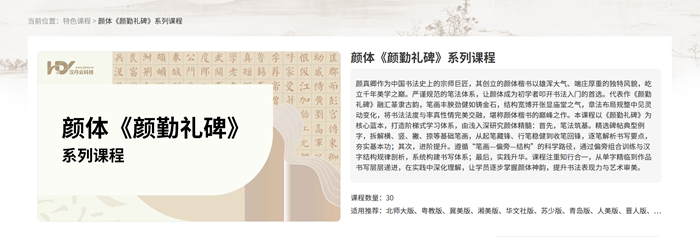 平臺如一座書法藝術(shù)寶庫,既有篆、隸、楷、行、草等傳統(tǒng)書體的教學(xué)滋養(yǎng),亦含硬筆與粉筆書寫的細致指導(dǎo);更輔以教學(xué)視頻、碑帖字帖、集字臨帖、云備課等模塊,為書法教學(xué)鋪就一條融合科技與傳統(tǒng)的創(chuàng)新之路,讓筆墨傳承煥發(fā)新的生機。