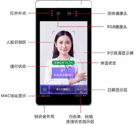 產品詳細介紹海唯智能測溫人臉識別終端系列三,采用8英寸LCD顯示屏幕、200萬像素攝像頭,內嵌深度學習人臉識別算法,集成高精度熱成像測溫芯片,ISP圖像處理等技術于一體的AI智能門禁產品。該產品具備人臉檢測、口罩檢測、人臉識別比對、體溫檢測、活體判斷等強大功能。可精確捕獲通過攝像機視野的人員信息(諸如面部信息、身份信息、是否戴口罩等信息)、以及體表溫度。可有效幫助用戶管理出入人員權限以及監測器體溫狀態,有助于防范疫情。用戶可通過加載人臉庫到設備,脫機管理出入權限。也可搭配考勤軟件,實現員工考勤管理。可廣泛應用于小區門禁、道閘通道、寫字樓等場景。 產品特征 集非接觸式體表溫度檢測+活體檢測于一體,快速篩查,提前預警 支持口罩檢測 支持戴口罩人臉識別 曠視FACE++深度人臉識別算法,穩定可靠 8寸屏幕,屏幕占空比90% 檢測體溫異常后現場輸出語音報警 支持脫機工作模式 支持HTTP協議,快速開發和集成,可向其他健康管理平臺提供數據接口,實現健康大數據聯動 采用1/2.8" 200萬像素超低照度傳感器,最大輸出分辨率為1920×1080@30fps, 超低照度CMOS,0.001Lux@(F1.2,AGC ON); 集成高精度熱像測溫模塊,測溫精度±0.3℃ 高性能嵌入式處理器,集圖像采集、人臉檢測、人臉跟蹤、人臉識別對比、活體判斷于一體; 集成曠視深度學習CNN神經網絡算法,動態識別無需特意配合; 檢測人員是否攜戴口罩; 支持體溫檢測 人臉識別、體溫檢測、口罩檢測自由配置多種使用模式; 識別速度≤100ms,識別率≥99.7%; 支持5萬人臉庫; 支持視頻疊加、體溫疊加; 可記錄識別信息和體溫信息,保存可追溯 支持韋根協議; 超薄金屬外殼 防雷、防浪涌保護措施; 防水等級IP66 |