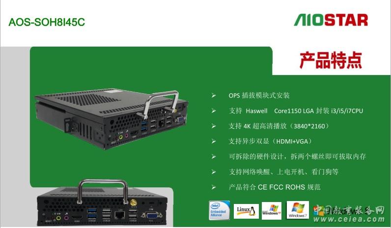 1概述編輯 Aiostar OPS 全稱為:Aiostar Open Pluggable Specification,開放式可插拔規(guī)范。是Intel與顯示器廠商共同制定的標(biāo)準(zhǔn)化數(shù)字標(biāo)牌接口規(guī)范。OPS內(nèi)部組成是一個(gè)X86架構(gòu)的迷你PC,采用英特爾酷睿處理器,配有內(nèi)存、硬盤、多種輸入輸出接口以及Windows操作界面,尺寸為200mm x 119mm x 30mm 。 以下為Intel 官網(wǎng)對于OPS的定義: 原文如下: Digital Signage Open Pluggable Specification :Simplify digital signage development Highlights Enables easier installation, use and maintenance of digital signs. Makes digital signage devices more intelligent and connected. Overview The open pluggable specification (OPS) helps standardize the design and development of digital signage devices and pluggable media players. Intel created OPS to address digital signage market fragmentation and simplify device installation, usage, maintenance and upgrades. OPS enables digital signage manufacturers to deploy interchangeable systems faster and in higher volumes, while lowering costs for development and implementation. Installing digital signage equipment based on Intel architecture helps you implement scalable digital signage applications that can network easily with other equipment. This simplifies interoperability and application upgrades designed to meet the digital signage requirements of individual customers, while helping to future-proof technology investments.[1] 譯文: 強(qiáng)調(diào) 更便于安裝、使用和維護(hù)的數(shù)字信號(hào)。 使數(shù)字看板設(shè)備更智能和融合。 概述 開放的可插拔的規(guī)范(OPS)有助于規(guī)范的設(shè)計(jì)和開發(fā)數(shù)字看板設(shè)備,并插入媒體播放器終端。Intel創(chuàng)造OPS 致力于數(shù)字看板市場分化和簡化設(shè)備安裝、使用、維護(hù)和升級(jí)。 OPS可以使數(shù)字看板制造商更快部署大量的交互系統(tǒng),同時(shí)降低開發(fā)和實(shí)現(xiàn)的成本。 安裝基于英特爾架構(gòu)的數(shù)字標(biāo)牌設(shè)備可以幫助您實(shí)現(xiàn)可伸縮的數(shù)字看板應(yīng)用程序,并且很容易和其他設(shè)備進(jìn)行網(wǎng)絡(luò)連接。這簡化了通過交互和升級(jí)的設(shè)計(jì)來滿足個(gè)人客戶的數(shù)字看板需求,同時(shí)有利于面向未來的技術(shù)投資。 2特點(diǎn)編輯 1、支持?jǐn)?shù)字標(biāo)牌等行業(yè)最新的OPS規(guī)范的電腦模塊,加速數(shù)字標(biāo)牌行業(yè)的標(biāo)準(zhǔn)化趨勢。 2、OPS模塊可以簡化設(shè)備的安裝、使用、維護(hù)和更新,幫助數(shù)字標(biāo)牌制造商降低開發(fā)和實(shí)施成本。 3、OPS可簡便地與其它設(shè)備聯(lián)網(wǎng),可擴(kuò)展數(shù)字標(biāo)牌應(yīng)用,滿足數(shù)字標(biāo)牌對交互和應(yīng)用更新的需求。 4、部分OPS平臺(tái)支持遠(yuǎn)程管理及低功耗模式,解決耗電及散熱要求。同時(shí)平臺(tái)所支持的Intel vPro、AMT遠(yuǎn)程管理技術(shù),實(shí)現(xiàn)設(shè)備無人操控下的高效運(yùn)作。如采用四代i5+Q87平臺(tái)的AOS-SOQ8I45A 5、OPS無風(fēng)扇散熱設(shè)計(jì),提供超靜音的解決方案,保證工作環(huán)境的安靜、清爽。發(fā)熱量小也帶來了較小的功耗。 3整機(jī)編輯 Intel 2011年提出該規(guī)范后,伴隨著日本NEC OPS接口顯示器的上市,傳統(tǒng)數(shù)字標(biāo)牌嵌入式主板走下神壇,OPS模塊化正式開啟。代表作品有 愛鑫微電子(AIOSTAR) AOS-SOH8I45A ,