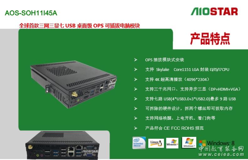 1概述編輯 Aiostar OPS 全稱為:Aiostar Open Pluggable Specification,開放式可插拔規范。是Intel與顯示器廠商共同制定的標準化數字標牌接口規范。OPS內部組成是一個X86架構的迷你PC,采用英特爾酷睿處理器,配有內存、硬盤、多種輸入輸出接口以及Windows操作界面,尺寸為200mm x 119mm x 30mm 。 以下為Intel 官網對于OPS的定義: 原文如下: Digital Signage Open Pluggable Specification :Simplify digital signage development Highlights Enables easier installation, use and maintenance of digital signs. Makes digital signage devices more intelligent and connected. Overview The open pluggable specification (OPS) helps standardize the design and development of digital signage devices and pluggable media players. Intel created OPS to address digital signage market fragmentation and simplify device installation, usage, maintenance and upgrades. OPS enables digital signage manufacturers to deploy interchangeable systems faster and in higher volumes, while lowering costs for development and implementation. Installing digital signage equipment based on Intel architecture helps you implement scalable digital signage applications that can network easily with other equipment. This simplifies interoperability and application upgrades designed to meet the digital signage requirements of individual customers, while helping to future-proof technology investments.[1] 譯文: 強調 更便于安裝、使用和維護的數字信號。 使數字看板設備更智能和融合。 概述 開放的可插拔的規范(OPS)有助于規范的設計和開發數字看板設備,并插入媒體播放器終端。Intel創造OPS 致力于數字看板市場分化和簡化設備安裝、使用、維護和升級。 OPS可以使數字看板制造商更快部署大量的交互系統,同時降低開發和實現的成本。 安裝基于英特爾架構的數字標牌設備可以幫助您實現可伸縮的數字看板應用程序,并且很容易和其他設備進行網絡連接。這簡化了通過交互和升級的設計來滿足個人客戶的數字看板需求,同時有利于面向未來的技術投資。 2特點編輯 1、支持數字標牌等行業最新的OPS規范的電腦模塊,加速數字標牌行業的標準化趨勢。 2、OPS模塊可以簡化設備的安裝、使用、維護和更新,幫助數字標牌制造商降低開發和實施成本。 3、OPS可簡便地與其它設備聯網,可擴展數字標牌應用,滿足數字標牌對交互和應用更新的需求。 4、部分OPS平臺支持遠程管理及低功耗模式,解決耗電及散熱要求。同時平臺所支持的Intel vPro、AMT遠程管理技術,實現設備無人操控下的高效運作。如采用四代i5+Q87平臺的AOS-SOQ8I45A 5、OPS無風扇散熱設計,提供超靜音的解決方案,保證工作環境的安靜、清爽。發熱量小也帶來了較小的功耗。 3整機編輯 Intel 2011年提出該規范后,伴隨著日本NEC OPS接口顯示器的上市,傳統數字標牌嵌入式主板走下神壇,OPS模塊化正式開啟。代表作品有 愛鑫微電子(AIOSTAR) AOS-SOH8I45A ,