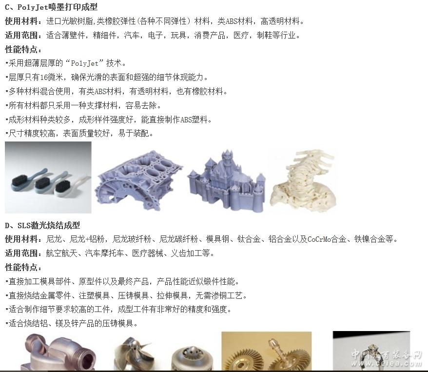 產品詳細介紹1、3D打印服務 3D打印技術已經成為每個工業領域快速產品研發的有力工具,許多新的3D打印技術在不斷地提高精度、制造速度、模型性能以及經濟效益,而且為迅速構建模型提供各種方法。包括: A、SLA激光固化成型 使用材料:進口和國產高品質光敏樹脂。 適用范圍:汽車,電子,玩具,消費產品,醫療,制鞋等行業。 性能特點: •高耐久性 •部件:類PP型 •良好的邊緣特性 •最好的斷裂伸長率 •極小氣味,無毒 B、FDM熔融堆積成型 使用材料:ABS,PC,PC-ABS ,PPSF。其中ABS材料制作的產品機械性能高;PPSF可耐高達230℃以上的高溫,PPSF材料在各種快速成型材料中,具有最高的強度、韌性、耐熱性及抗化學性。 所有材料均是生產級材料,可以直接測試或重復使用,并可以進行二次加工等。 適用范圍:可以直接制作結構復雜的裝配原型件,適合航空航天、汽車摩托車、小家電、電動工具,醫療器械、醫療電子、玩具產品、數碼雕塑及汽車零部件的設計開發和性能驗證等。 性能特點: •選用標準工程熱塑性塑料,如ABS,PC等可以用來生產結構功能原型。 •在制造果汁機、電動工具、汽車零件等方面,適用于高強度沖擊的產品功能測試。 •在醫療器材方面, 可進行γ輻射或氧化乙烯(EtO)消毒。 •在航天零部件業具有防火性。 •小家電設計業與汽車設計業具有抗化學性以及200℃以上還能持續運作。 •在食物調理與醫療產品方面可以進行消毒。 •使用PPSF材料總是呈現著耀眼的金黃色,令人愛不釋手。 •模型并不會產生翹曲,收縮,或是吸收濕氣。 C、PolyJet噴墨打印成型 使用材料:進口光敏樹脂,類橡膠彈性(各種不同彈性)材料,類ABS材料,高透明材料。 適用范圍:適合薄壁件,精細件,汽車,電子,玩具,消費產品,醫療,制鞋等行業。 性能特點: •采用超薄層厚的“PolyJet”技術。 •層厚只有16微米,確保光滑的表面和超強的細節體現能力。 •多種材料混合使用,有類ABS材料,有透明材料,也有橡膠材料。 •所有材料都只采用一種支撐材料,容易去除。 •成形材料種類較多,成形樣件強度好,能直接制作ABS塑料。 •尺寸精度較高,表面質量較好,易于裝配。 D、SLS激光燒結成型 使用材料:尼龍、尼龍+鋁粉,尼龍玻纖粉、尼龍碳纖粉、模具鋼、鈦合金、鋁合金以及CoCrMo合金、鐵鎳合金等。 適用范圍:航空航天、汽車摩托車、醫療器械、義齒加工等。 性能特點: •直接加工模具部件、原型件以及最終產品,產品性能近似鍛件性能。 •直接燒結金屬零件、注塑模具、壓鑄模具、拉伸模具,無需滲銅工藝。 •適合制作細節要求較高的工件,成型工件有非常好的精度和強度。 •適合燒結鋁、鎂及鋅產品的壓鑄模具。