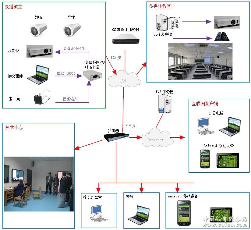 系統基于校園網,并擴展至互聯網應用,可以實現校園網上任何一間多媒體教室內教學的錄制和直