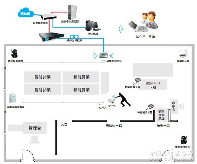 通過整體RFID、無線傳感器網絡、WiFi等物聯網綜合技術,加以配備必要的賣場設施設備布置,實現人流量檢測、商品識讀和動態監控、動態盤點、補貨提醒、智能上架、智能揀貨、電子價簽制作、商品信息推送、購物引導、試穿體驗統計、環境監控、自動結算、商品追溯查詢等智慧超市應用。