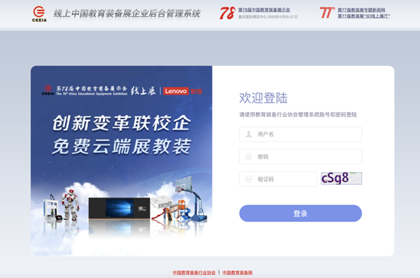 登錄“中國教育裝備行業協會管理系統”(zh.ceiea.com),進入“展會管理”欄目,點擊左側功能菜單“線上展”,系統將自動跳轉至“線上中國教育裝備展企業后臺管理系統”;也可以直接登錄“線上中國教育裝備展企業后臺管理系統”(https://www.ceepsp.com/Subadmin),用戶名及密碼為行業協會管理系統的賬號及密碼!熬上中國教育裝備展企業后臺管理系統”基于chrome瀏覽器開發,建議使用chrome瀏覽器瀏覽本站,其他瀏覽器可能存在不兼容現象。
