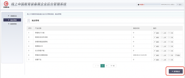 2.新增參展產品:本屆展示會參展企業,除上報參展產品外,還可在本系統中新增產品的信息和數據。在【展品管理】頁,點擊【新增展品】,按要求填寫相應內容。新增的產品只在“線上展”展示,不收錄到《第78屆中國教育裝備展示會參展產品名錄》。