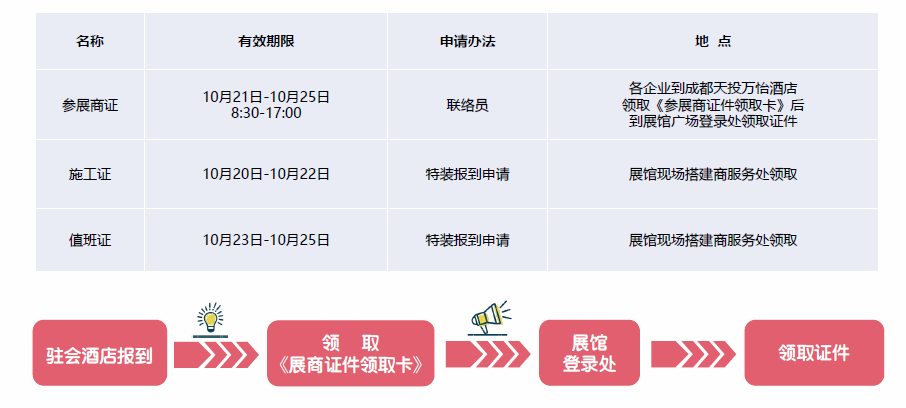 3.參展商到展會駐會酒店成都天投萬怡酒店(成都市雙流區天府新區博覽城路288號)聯絡員房間(具體報到房間見酒店大堂公示)領取《展商證件領取卡》,再到中國西部國際博覽城展館廣場入口的登錄處換取參展商證:一個展位配2張參展商證。