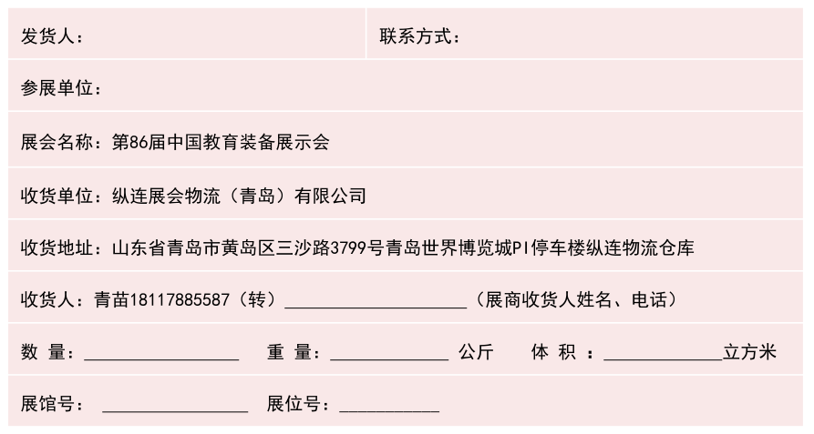 您也可以自行將展品發運至參展地倉庫,請按以下收貨信息自行填寫運輸單據,并在外包裝的醒目位置貼上嘜頭,相關信息如下: